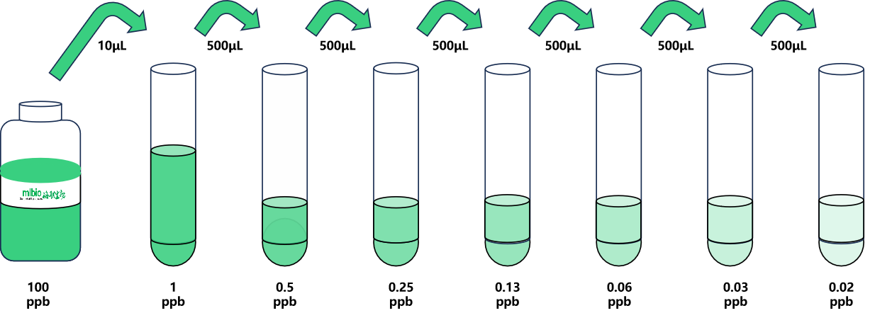 試劑盒中取出標準品,準備7個試管,先將100ppb標準品(200µL)按需吸取一定量用1×稀釋液稀釋至1ppb(例:10µL的標準品母液+990µL的1×稀釋液,制備得到1000μL的1ppb濃度標準品),隨后在6個試管中分別加入500μL的1×稀釋液,在這6個單獨的試管中將1ppb標準品依次2倍倍比稀釋至7個梯度,共配制7個濃度的標準品,依次為:1ppb、0.5ppb、0.25ppb、0.125ppb、0.06ppb、0.03ppb、0.015ppb,從最高濃度標準品溶液中吸取500μL標準品到下一個試管中,輕輕吹打混勻,以此類推進行標準品的倍比稀釋(如圖所示),1×稀釋液用作零濃度標準品(0ppb)。